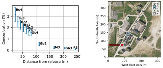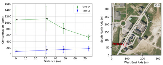 - A background concentration was calculated for each sensor. The average concentration over an interval of 1 min prior to the release was used. Then, the background concentration was subtracted from all the data to obtain the relative concentration.