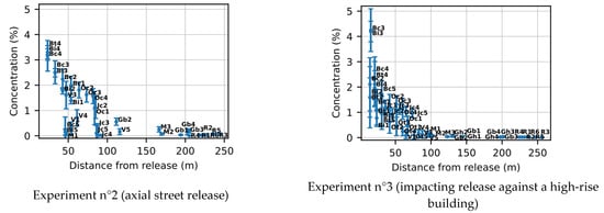 The mean and standard deviation of all the sensors in experiments 2 and 3 are presented in Figure 15. The concentration of the closest sensor is higher for experiment 3 because of the accumulation of gas in front of the impacted building. Once again, we can see that the decrease in concentration is faster for experiment 3 due to the impact on the building which leads to greater dilution.