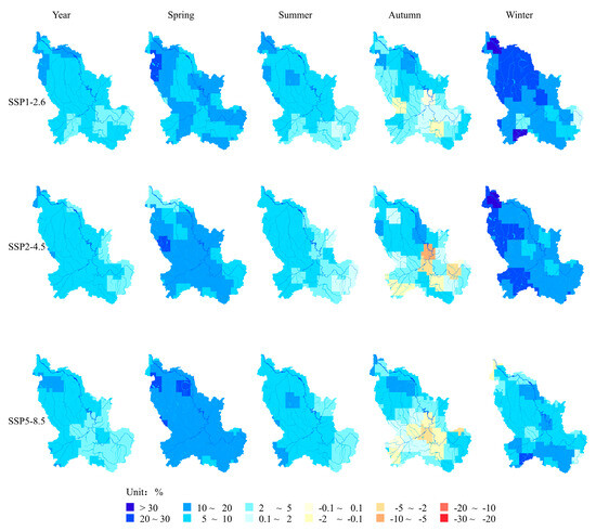 All five models under the SSPs scenarios projected an increase in temperature from 2021 to 2050 and showed a good agreement (Table 4). The annual mean temperature increased by 1.6 °C, 1.3 °C, and 1.6 °C, respectively. For the seasonal mean temperature, the increase was most pronounced in winter, about 0.28 °C higher than the annual mean, while the spring and summer temperatures showed a decreasing trend, about 0.20 °C and 0.16 °C lower than the annual mean, respectively. The projected temperature showed an increasing trend under the selected models, with MIROC-ES2L having the largest increase and MPI-ESM1-2-HR having the smallest increase in temperature under the SSP1-2.6 and SSP5-8.5 scenarios, respectively. In contrast, CMCC-ESM2 had the smallest increase under the SSP2-4.5 scenario.