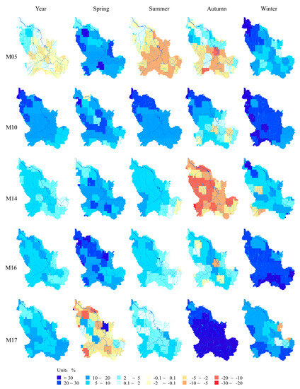 The projected precipitation changes for the 2021–2050 under the SSP5-8.5 scenario are shown in Figure 8. The annual precipitation for the GCMs trended upwards under the SSP5-8.5 scenario, with the most significant increase projected by MPI-ESM1-2-HR. CMCC-ESM2 projected a decrease in summer precipitation above the Wu Daogou station and a decrease in autumn above the Guan Madian station. EC-Earth3-Veg-LR projected a significant decrease in winter, with a decrease of more than 10% above the Gaoli Chengzi station. Similarly, IPSL-CM6A-LR projected a more significant reduction in winter precipitation, with a decrease of 20% above Hai Long station. MIROC-ES2L projected a slight decrease in summer precipitation. MPI-ESM1-2-HR showed an increase in precipitation in all seasons of the basin.