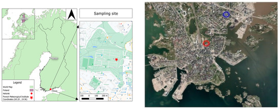 The capital of Helsinki and its surroundings are situated on a coastal region by the Baltic Sea at 60.2° latitude. The metropolitan area of Helsinki consists of four cities (Helsinki, Espoo, Vantaa, and Kauniainen) covering an area of 743 km2 with a population of more than one and a half million inhabitants [48]. The current survey focused only on the Helsinki city and specifically on the Finnish Meteorological Institute (FMI) facilities.