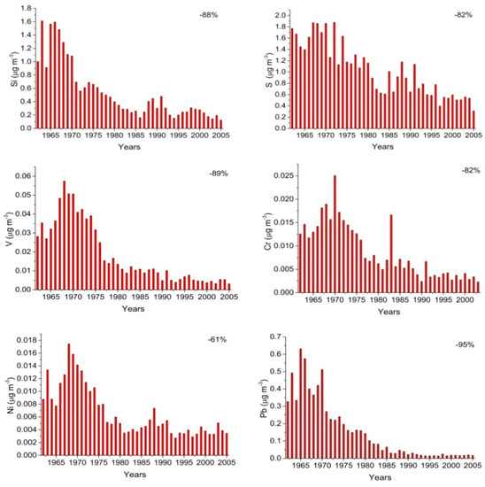 The annual average concentrations of Si, S, V, Cr, Ni, Pb elements (in μg m−3) at Helsinki station (FMI). In the right corner of each diagram, the percentage reduction of each element is noted.