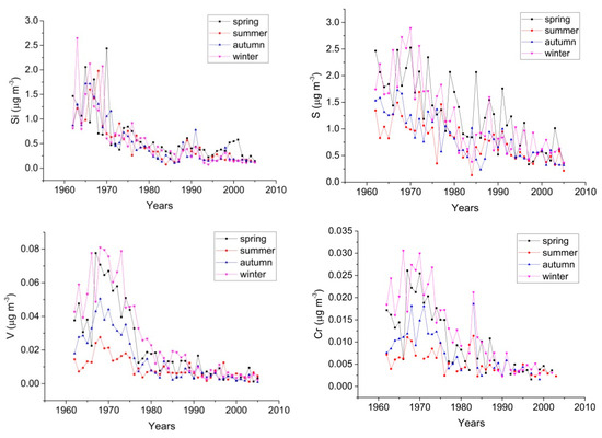 Fluctuations in atmospheric concentrations of different chemical elements found in the air occur due to the varying weather conditions across seasons and the sources and emissions of air pollutants. The seasonality can cause significant changes in elemental concentrations in the study region. The mean seasonal concentrations for specific elements (Si, S, V, Cr, Ni, and Pb) are plotted as a function of time in Figure 4 (The rest of the elements are presented in Figure S2 in the Supplementary Materials).