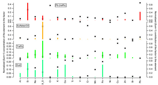 By using the source apportionment approach described in Section 2.2, we were able to identify four PM sources, each one defined by a corresponding factor (Figure 5). Since only elemental tracers were available and the resolution of the samples was very low, it was not possible to identify more PM sources.