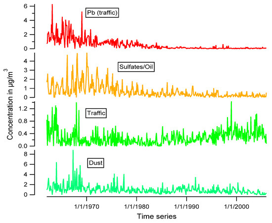 Source apportionment analysis by applying the SoFi software revealed four emission sources: road dust (“Pb (traffic)”), heavy oil combustion/secondary sulfates (“Sulfates/Oil”), traffic emissions (“Traffic”), and natural dust–soil (“Dust”). The (“Pb (traffic)”) factor explains the highest emissions of Pb, Cl, and Si before the mid-1970s and very low concentrations in the mid-1980s onwards, being an index of the complete leaded fuel ban starting at the beginning of the 1990s in all European countries. The (“Sulfates/Oil”) factor had a higher contribution during the 1970s, most likely due to the higher use of oil during that time.The “Traffic” factor was higher before the 1970s due to the worst fuel quality in that era and increased emissions, while its contribution increasedagain from the mid-1990s due to the increasing car fleet number. The “Dust” factor had elevated contribution before the 1970s, related to the sand that was dispersed on streets covered with snow in order to improve traffic safety but without the enhanced street cleaning methods adopted currently.