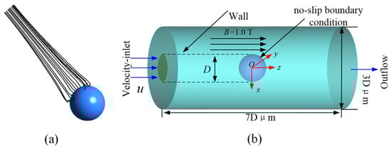Figure 1 shows the Fe-based fine particle collision model. The collision process of Fe-based fine particles in a uniform magnetic field can be regarded as a particle-to-particle trapping process, as shown in Figure 1a. It can be seen from Figure 1b that the direction of the uniform magnetic field was consistent with the movement speed of the inlet particles, and the gravity was in the -Z axis direction, the model inlet was a velocity inlet with uniform velocity distribution, the model outlet was a free outflow, the air density was 1.225 kg/m3, the periphery boundary was set as a wall, and a no-slip boundary condition was adopted for the core particle surface []. When the length and height of the calculation domain were greater than 5 times and 1.5 times of the core particle diameter, a stable flow field was formed in the calculation area without affecting the particle trapping efficiency [,]. Therefore, the distance from the inlet and outlet of the model to the core particle center was 3.5D, the width and height were 3D, and the core particle size was the same as that of the inlet particle.
