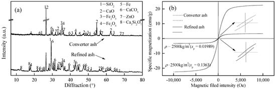In addition, taking converter ash and refined ash as examples, Figure 2 shows the magnetic characteristics of Fe-based fine particles emitted during steelmaking in the iron and steel industry. As seen from Figure 2a, Fe-based fine particle XRD testing showed that Fe-based fine particles contained Fe2O3, Fe3O4 and other ferromagnetic substances, which had the characteristics of easy magnetization in the magnetic field. Figure 2b shows the VSM curve of converter ash and refined ash. The VSM hysteresis loop shows that when the external magnetic field intensity reached 0.5 T, the specific saturation magnetization of converter ash and refined ash was 22.5 emu/g and 3.32 emu/g, respectively. The calculated magnetic susceptibility of the two kinds of dust was 0.1363 and 0.01989, respectively, indicating that the magnetic properties of converter ash are greater than those of refined ash, and it is more easily magnetized in the magnetic field.