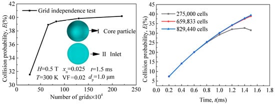 In order to eliminate the influence of the number of grids on the numerical simulation, the grid independence test was carried out on the calculation model, and the optimal grid number was determined by calculating the collision probability between particles under different grid numbers. Due to the symmetry rule of the calculation area, the grid used in the calculation was a hexahedral structured grid, and the spherical wall of the core particle was refined. The calculation results are shown in Figure 6, with the increase in the number of grids, the magnetic coagulation removal efficiency first increased and then stabilized. When the number of grids increased from 270,000 to 650,000, the efficiency of magnetic coagulation removal changed to 0.5%. When the number of grids increased from 820,000 to 1,290,000, the efficiency of magnetic coagulation removal changed to 0.44%, and when the number of grids increased from 1,290,000 to 2,200,000, the efficiency of magnetic coagulation removal changed to 0.34%; that is, when the number of multi-fiber trapping structure grids reached about 650,000, the efficiency of magnetic coagulation removal remained basically unchanged. Therefore, 820,000 grids were selected for numerical simulation calculation.