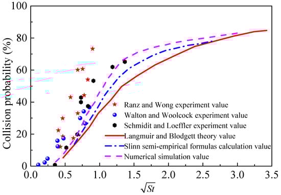 Comparison of numerical simulation value and experiment value of particle collision probability: Ranz and Wong []; Walton and Woolcock []; Schmidt and Loeffler []; Langmuir and Blodgett []; Slinn [].