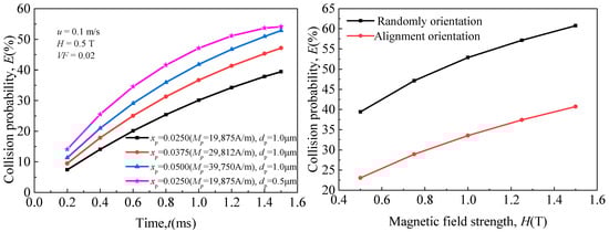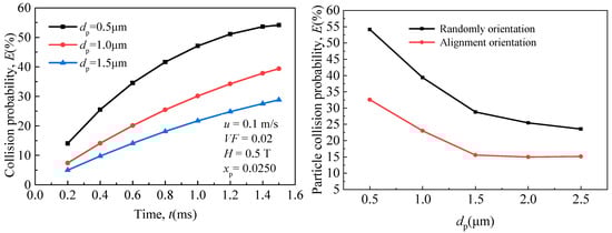 By analyzing the physical properties of the dust produced in the production process, it was found that after the raw Fe ore is crushed and steam-condensed at high temperature, there are many metal components in the particles, and the content of Fe element is much higher than that of other elements [,], and Fe magnetic substances such as Fe3O4 and Fe2O3 are the main components of the dust []. Therefore, it can be seen that many easily magnetized Fe-based fine particles are produced in the production process of the iron and steel industry, which can be magnetically coagulated by the magnetic field effect and then removed. In the traditional flow field, the motion state of particles after collision depends on the relative magnitude of drag force, gravity, viscous force (Van der Waals force), and collision elastic force []. When dp < 30 μm, the viscous force, represented by Van der Waals force, is dominant in this region. When particles collide or contact with each other, the collision coagulation effect occurs []. When a uniform magnetic field is added to the flow field, the particles in the flow field are not only subjected to drag force and gravity but also to magnetic dipole force before collision. When dp < 10 μm, the ratio of magnetic dipole force to drag force is less than 1, and the ratio to gravity exceeds the order of magnitude of 102 []. Although the magnetic dipole force is smaller than the drag force, they are in the same order of magnitude. Before particles collide with each other, the existence of magnetic dipole force accelerates the collision coagulation effect. When particles collide with each other, the colliding particles are subjected to the combined action of five forces: drag force, gravity force, viscous force, collision elastic force, and magnetic dipole force, and the existence of magnetic dipole force enhances the collision coagulation effect. Chinese and foreign scholars have done a lot of research on the magnetic coagulation process of ferromagnetic particles in the magnetic field.