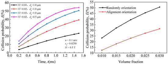 Figure 9 shows the influence of the particle volume fraction on the magnetic coagulation of Fe-based fine particles in the composite field. As shown in the figure, the magnetic coagulation removal efficiency of Fe-based fine particles gradually increased with the change of residence time. The greater the particle volume fraction, the better the magnetic coagulation effect of Fe-based fine particles. When the particle volume fraction grew from 0.01 to 0.03, the magnetic coagulation coefficient of Fe-based fine particles increased from 0.2353 to 0.5061. The reason is that the increase of the particle volume fraction increases the number of particles in the composite field. Although the relative motion intensity of particles with the same particle size was unchanged under the same magnetic dipole force, the change in the quantity increased the probability of the collision between particles. The magnetic coagulation coefficient of Fe-based fine particles presented a quadratic functional relationship with the volume fraction, expressed as follows: . In addition, with the increase of the particle volume fraction, the magnetic coagulation strength of Fe-based fine particles under the random magnetic dipole orientation was greater than that under the aligned magnetic dipole orientation, and the difference between the magnetic coagulation removal efficiency under the random magnetic dipole orientation and that under the aligned magnetic dipole orientation was enlarged.