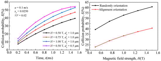 Figure 10 shows the influence of external magnetic field strength on the magnetic coagulation of Fe-based fine particles in the composite field. As shown in the figure, the magnetic coagulation removal efficiency of Fe-based fine particles gradually increased with the change of residence time. The greater the applied external magnetic field strength, the better the magnetic coagulation effect of Fe-based fine particles. When the applied external magnetic field strength increased from 0.5 T to 1.0 T, the magnetic coagulation coefficient of Fe-based fine particles increased from 0.3940 to 0.5288. This is because the greater the applied external magnetic field strength, the greater the magnetic dipole force between two particles after magnetization, and the greater the relative motion intensity of particles under the magnetic dipole force. The magnetic coagulation coefficient of Fe-based fine particles showed a quadratic functional relationship with the applied external magnetic field strength, expressed as follows: . In addition, as the applied external magnetic field strength increased, the magnetic coagulation strength of Fe-based fine particles under the random magnetic dipole orientation was greater than that under the aligned magnetic dipole orientation, and the difference between the magnetic coagulation removal efficiency under the random magnetic dipole orientation and that under the aligned magnetic dipole orientation remained basically unchanged.
