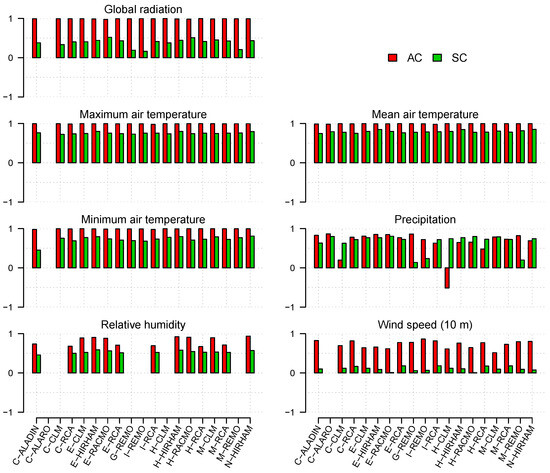 For the TSs and all RCMs, monthly aggregate values for all years of the validation period were calculated for each meteorological element. Specifically, for each month (; over all TSs and all years), the value was calculated as the average over all days within a given month m. Similarly, for a given RCM (over all grids and all years), the value is the average over all days within a certain month. Thus, 12 monthly values were obtained. Then, the AC was calculated as the Pearson correlation coefficient, as follows: