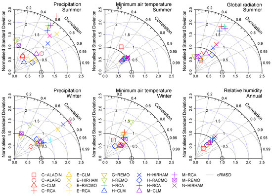 Taylor diagrams of the spatial variability of the global and regional climate model (GCM-RCM) pairs: Pearson correlation coefficient, normalized standard deviation and centered root mean square difference (cRMSD) for the precipitation and minimum air temperature in summer and winter, the global radiation in summer and the annual relative humidity, in which problematic validation characteristics are observed. The same symbols are used for the same RCMs, and the same color is used for the same driving GCM. The abbreviations of the GCM-RCM pairs are given in Table 1.
