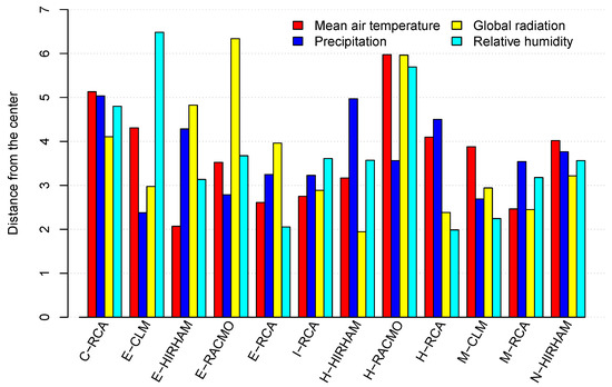 In the case of the Czech Republic, there are 12 well-performing models out of the 19 original RCMs from which the CliChE can be established. First, one model that is central based on the mean air temperature, precipitation and global radiation was identified. This task was conducted in such a way that models with a larger distance from the center (Figure 4) were successively removed. Based on the distance in terms of the temperature, the H-RACMO, C-RCA and E-CLM models were removed since they exhibited relatively large distances. Then, based on the distance in terms of precipitation, the H-HIRHAM, H-RCA and E-HIRHAM models were removed, and subsequently, based on solar radiation, the E-RACMO, E-RCA and N-HIRHAM models were removed. In the end, only three models, i.e., I-RCA, M-CLM and M-RCA, were left. Note that the same three models would also remain if the models were removed differently, namely, applying a different order of meteorological elements: removing one model by the mean air temperature, one model by precipitation and one model by the global radiation and repeating this process three times. These results confirm that the applied process is correct and sufficiently robust. Of the three models left, M-RCA was selected as the central model since it showed the minimum distance in terms of the temperature and global radiation and a similar distance in terms of precipitation relative to the other two models. As a control meteorological element, the relative humidity was used, for which the distances were not large and similar for all three models.