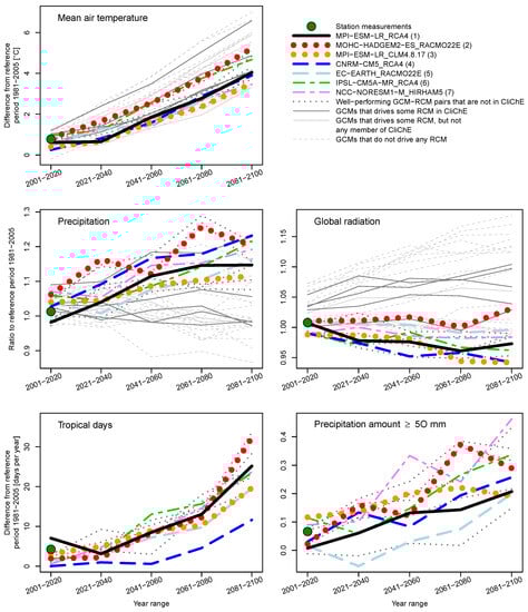 Estimated climate change as the average differences over 20-year periods from the average reference period (1981–2005) for the mean air temperature in degrees Celsius, the number of tropical days and the number of days with precipitation amounts equal to or greater than 50 mm and as precipitation and global radiation ratios to the reference period values. The global climate models (GCMs) are plotted in gray, while the global and regional climate model (GCM-RCM) pairs are marked in different colors. The green points indicate the observed climate changes in the Czech Republic represented by the station measurements (technical series). The GCM-RCM pairs are numbered based on their membership in the climate change envelope (CliChE); details are given in the text and listed in Table 2.