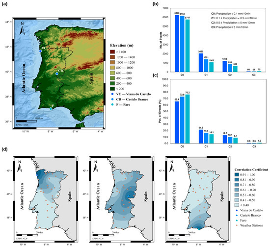 (a) Hypsometric map of mainland Portugal (elevation in m), with three weather stations (VC, CB, and F) with sub-hourly data (timescale of 10 min, 2000–2022) used in the calculation of the different classes of precipitation (C0–3). (b) Bar chart of the number of events recorded in each station and by precipitation class. (c) Bar chart of the percentage of events over the total number of precipitation records in each station and by precipitation class. (d) Spatial distribution of the Pearson correlation coefficients between daily precipitation in the three main weather stations (VC, CB, and F), excluding days without precipitation, and the remaining weather stations (see legend).