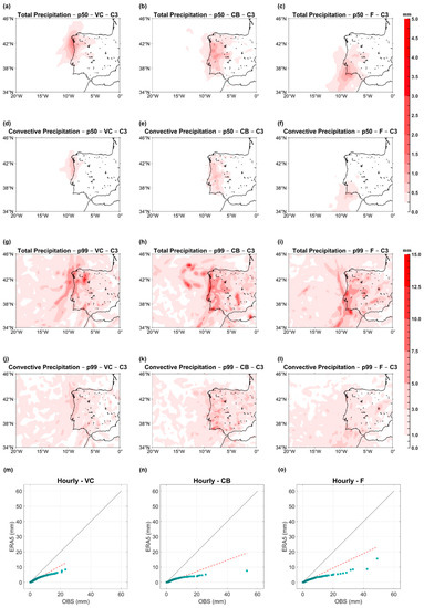 Figure 2 shows the 50th and 99th percentiles (p50 and p99) for ERA5 TP (Figure 2a–c,g–i) and CP (Figure 2d–f,j–l) for the highest precipitation class, C3, and by WS. Regarding the medians (p50), the maxima of both total precipitation and convective precipitation are located close to the corresponding weather station. Convective precipitation also contributes to the total precipitation. It is also worth mentioning that the precipitation core has a significant extension over maritime areas in VC and F, whereas, in CB, the core is mostly located over land areas of the Iberian Peninsula. It is relevant to note that, for half of the SHHP events (>5 mm/10 min), ERA5 displays hourly accumulated precipitation of less than 5 mm. When considering the 99th percentile (p99), similar conclusions can be drawn, but showing very localized mesoscale cores, with values ranging from 10 to 15 mm. When comparing hourly observations with ERA5 reanalysis (Figure 2m–o), it is clear that ERA5 strongly underestimates precipitation, mostly for precipitation above 10 mm, in line with [56].