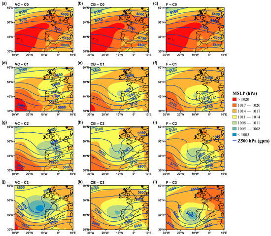 Hourly composites of MSLP (in hPa) (shading) and Z500 (in gpm) (contour lines represented in blue, with a spacing of 50 gpm) for (a–c) C0, (d–f) C1, (g–i) C2 (j–l), and C3.