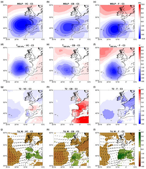 Regarding Td and W, VC events (Figure 4j) show a positive anomaly over the Iberian Peninsula, extending to the Bay of Biscay and the Balearic Islands. In turn, negative Td values are found over the Azores, with anomalies ranging from −3.0 °C to −1.5 °C. The wind vector fields for the three region scenarios (Figure 4j–l) show typical low-pressure system patterns, with cyclonic circulation, with the low system shifting southward relative to each corresponding region. This type of circulation leads to a greater advection of Atlantic air masses, which are typically more humid, towards the Iberian Peninsula, causing an increase in the amount of water vapour available in the mainland region (cf. Figure S2). For F events, a pattern identical to that described for VC is clear; however, the Td anomaly is more intense in the Iberian region (up to +4 °C). This can be explained by the location of the low-pressure system, which advects tropical maritime air masses; these are typically more unstable and humid. Finally, for CB events, a positive anomaly in the Iberian Peninsula region is still observed, and it is more intense in the southern region.