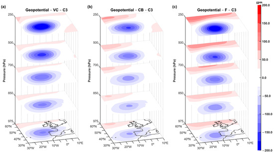 Composites of hourly anomalies of geopotential anomalies (in gpm) for precipitation class C3 (SHHP events), at different vertical pressure levels, and for (a) VC, (b) CB, and (c) F.