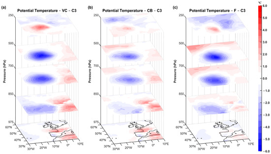 In the region of negative geopotential anomalies associated with low-pressure systems, the potential temperature also reveals a negative anomaly in the middle and lower troposphere (Figure 6), with values ranging from −3 to 5 °C, for SHHP events in the three locations; this phenomenon is slightly weaker for CB events. These anomalies are consistent with the establishment of a cold core (Figure S3) that is more pronounced at mid-levels and for events in VC and F, with anomalies reaching −4.5 °C and −6.0 °C, respectively, for VC and F events. At 250 hPa, above the cold core, there is a weak positive potential temperature anomaly, consistent with a positive temperature anomaly, suggesting the presence of subsidence near the tropopause.