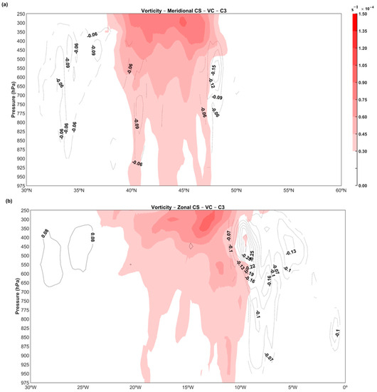 Still related to the dynamics of SHHP events formation, Figure 7 shows the anomaly for vorticity and omega vertical velocity for VC. The results referring to CB and F are presented in the Supplementary Materials (Figures S4 and S5). The representation of these variables was achieved from both the meridional and zonal cross-sections, sections that cross the absolute minimum in the MSLP composites (cf. Figure S6). Figure 7a represents the meridional cross-sections (north–south axis), while Figure 7b represents the zonal section (east–west axis).