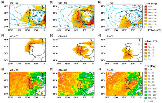 It is possible to identify quite distinct patterns for the different situations under consideration (Figure 8a–c). Regarding the composites calculated for VC, and focusing our analysis on mainland Portugal, it is possible to verify higher values of CAPE in the coastal regions, especially in the northwest, with CAPE values ranging between 150 J kg−1 and 200 J kg−1. Concerning the highest TT-index values, these are in line with the highest CAPE values, with values exceeding 48 °C. As for CB events, there is an increase in CAPE values throughout mainland Portugal, particularly in the central and coastal regions, with CAPE values > 350 J kg−1. The TT-index also displays higher values in the central region, exceeding 48 °C. For F events, higher CAPE and TT-index values are found in the southernmost region of mainland Portugal, with the maximum occurring near F, ranging from 200 J kg−1 to 250 J kg−1 for CAPE, and with a TT-index exceeding 48 °C. It is worth noting that, for the weaker precipitation events (C1 and C2), CAPE presents lower values (<150 J kg−1). For these events, the TT-index also reaches lower values, below 46 °C and 48 °C, respectively, for C1 and C2 events (Figure S7). Figure 8g–i shows that heavy precipitation events are associated with low values of CIN (<50 J kg−1) near the location of the events. For the other classes of events, there is a noticeable increase in CIN values (Figure S8), reaching maximum values (>250 J kg−1) for the C0 events (no rain).