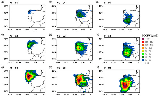 Ice particles comprise a large fraction of convective cloud systems, and ice melting is a key process in the precipitation associated with these systems [62]. Therefore, an analysis of ice cloud formation was performed for the precipitation classes C1, C2, and C3 (Figure 9). Figure 9 clearly shows a relationship between the amount of cloud ice and the amount of precipitation. For C1 events, the lowest values of TTCIW are observed, reaching up to 60 g m−2 for VC, and 70 g m−2 for CB and F. For class C2, an increase in the TCCIW for the three WSs is noticeable, with values reaching 100 g m−2 in CB, and 90 g m−2 for VC and F. Finally, for class C3 (SHHP events), the highest values of TCCIW are visible in VC, concentrated in northwest IP, exceeding 120 g m−2. For CB, the level of ice formation is higher in the northern and central regions, with the maxima in the central region; meanwhile, for F events, there is a higher concentration of TCCIW in the southern region of Portugal, with values higher than 120 g m−2. These results show that the presence of a greater amount of cloud ice is associated with SHHP events.