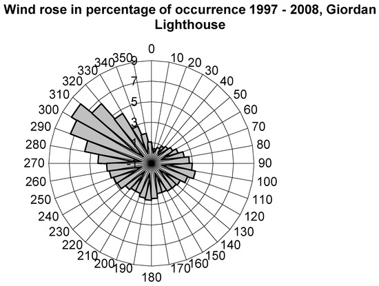 Wind rose based on the whole year data for the Giordan Lighthouse station showing wind direction frequencies.
