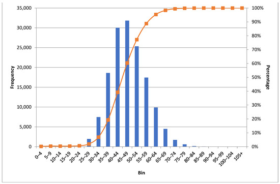 Distribution of the hourly average ozone volume fractions from 1997 to 2019. Hourly averages of the ozone volume fraction are distributed in sets with the range of 5 ppb and shown with vertical columns. The red line shows the percentage of hourly averages of ozone volume fractions considered until the given set.