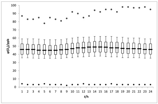 Box and whiskers plot of the hourly ozone volume fractions with statistical values from the whole dataset. Maxima and minima (upper and lower extremes) are shown with a dot, the upper whisker shows the 90th percentile, the upper box line shows the 75th percentile, the inner box line shows the median, the lower box line shows the 25the percentile and the lower whisker line shows the 10the percentile. φ(O3) stands for hourly ozone volume fractions. Values on the x-axis are the hours in the day when the data were obtained.