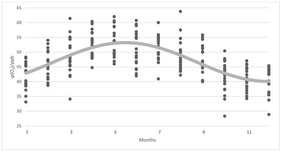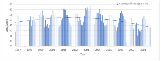 Monthly averages of ozone volume fractions φ(O3) for the period from 1997 to 2008 in which maximum values of ozone volume fractions occurred. The dotted line represents quadratic polynomial regression with the corresponding equation. Units given in the equation are ppb/month on the appropriate polynomial order. Intercept points represent the value for the year 1997 as the first year of measurements.