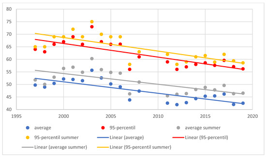 As was indicated earlier, hourly ozone volume fractions are decreasing in the period observed. To further prove that indication, linear regression analysis with the 95% confidence interval has been used. From Figure 8 it can be seen that average values are decreasing with a slope of −0.46 ± 0.08 ppb/year, which is equivalent to an about 1% decrease rate. Similar values are obtained for the summer (April to September) values where a decrease equals slightly less −0.43 ± 0.10 ppb/year. For a better insight, 95th percentile values are also taken into account. The rationale behind this is that high values are of greater concern regarding the environmental and health safety issues. Still, since the maxima can be isolated events which could impact the conclusion significantly, it is better to use slightly lower values, the 95th percentile being a fairly good choice. From Figure 8 it can be seen that higher values are decreasing with an even higher rate, which is −0.54 ± 0.11 ppb/year in both cases—based on the whole year data or just during the summer period. This leads to the conclusion that there is an obvious decrease in hourly ozone volume fractions or, in relation to this, the concentration of ozone in the maritime boundary layer in this area based on near surface measurements. This analysis also shows the importance of longer periods of measurement. In the previous analysis [34], only the first 4 years were considered, during which period a positive trend was observed. But this analysis shows that in the much longer period, and what is more important, closer to the present, such a conclusion is no longer correct.