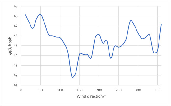 Wind direction and ozone concentration were compared to give an insight into offshore and onshore wind influences (Figure 11). The station is located in the north of Gozo with northern winds coming from the sea and southern winds coming from the island of Gozo itself and further south from the island of Malta. It can be seen here that higher ozone volume fractions are connected with the northern winds (between 270° and 90°) and lower ozone volume fraction values with southern winds (90° to 270°). This further proves the conclusion made from the wind rose and air trajectories that most ozone is transferred to the site from the north. In addition, ozone is less depleted when transferred over the sea due to a lack of photochemical reactions. The average difference is not very high but is in accordance with the relatively low diurnal production and depletion cycle.