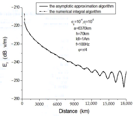 Figure 2 shows the variation in the electric field component along the propagation distance, where the solid line represents the result calculated by the asymptotic approximation algorithm, and the dashed line represents the result calculated by the numerical integral algorithm. The calculations are both under the condition that the dipole is located 5 m in the soil foundation, and the receiving point is located on the surface of the Earth, which is not close to the field source and the antipode, and the frequency is f = 100 Hz, and .
