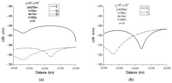 Variation in the electromagnetic field components along the distance from antipode. (a) electric field component; (b) magnetic field component.