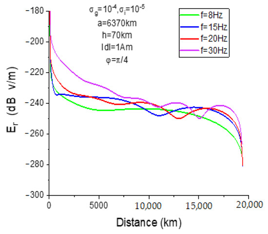 It can be seen in Figure 4 that different-colored line segments are used to represent the different frequencies. Their wavelength is less than half of the perimeter of the Earth when the frequencies are equal to 15 Hz, 20 Hz, and 30 Hz. The “interference” phenomena of two waves’ propagation along the short great-circle way and the long great-circle way are more and more evident when they pass through the antipode to the receiver, because the attenuation ratio of the SLF wave propagation in the cavity is very small. The values of the electric field component become more and more small along the propagation distance. The “interference” phenomena become more and more obvious with the increase in the frequency. The wavelength is almost equal to the perimeter of the Earth when the frequency is equal to 8 Hz. The fields in the cavity are a kind of “standing wave”, and the “interference” phenomenon already disappears.