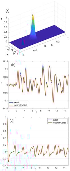 Time series data from a network of seven sensors are used to approximate the wave field u by solving the systems (25). (a) The locations of an eighth and ninth sensor in red plotted on the initial state of the system (15). (b,c) Comparisons of time series of the eighth and ninth sensors to the reconstructions of the time series at those locations using the network of seven sensors.