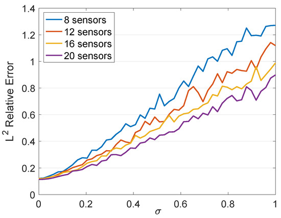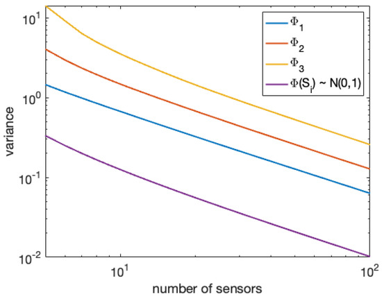 are used. The variance (28) is also plotted for the case where . On this log–log plot, the slope of each line is approximately , meaning that the variance in each case decays as , where n is the number of sensors. Figure 3 shows how the relative error depends on the number of sensors and the noise level of the sensors. In this figure, the error is the error in approximating the time series of an additional sensor.