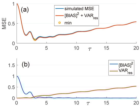 The error resulting from the noisy current density is then described in terms of the variance term , and the deterministic error is described in terms of the squared-bias term . The variance can be computed explicitly in simple cases and grows linearly with respect to the length of the time series , i.e., . As a result, there is a bias–variance tradeoff. In Figure 4, the mean squared error of a coefficient is displayed. The MSE initially decreases as a result of the decreasing squared bias. After reaching a minimum, the MSE begins to grow roughly linearly as a result of the variance term. The observation time that minimizes the MSE is the “optimal” observation time. In Figure 4, the dominant variance term which can be calculated analytically is displayed along with the squared bias and MSE. This optimal observation time can be utilized to estimate each of the coefficients and reconstruct the electric field .