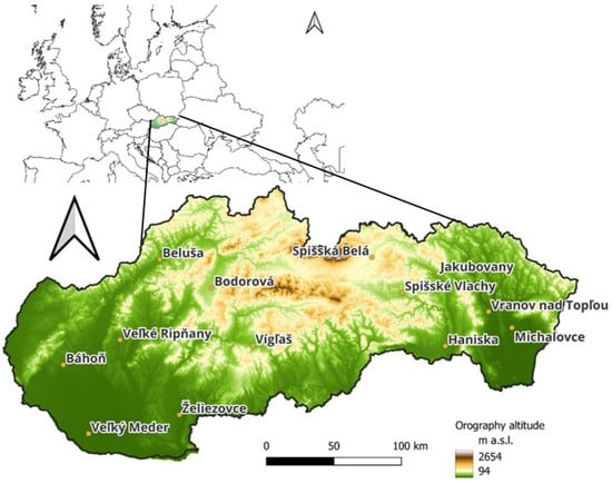 Slovakia is a landlocked Central European country with a temperate climate. It lies approximately between 47° and 50° N and 16° and 23° E (Figure 1). Due to its complex orography, there can be different climate conditions within a small area. The middle of the country and northern areas are mainly mountainous (the Carpathian Mountains) with the highest peak, Gerlachovský štít (2654 m.a.s.l.), and the coldest place in the country according to the average annual air temperature, Lomnický štít −2.9 °C (for the period 1990–2019) [31]. The southern, southeast, and southwest of the country belong to the Pannonian Basin, with the Danubian Lowland in the southwest of the country and the East Slovakian Lowland in the southeast. One of the warmest stations, Hurbanovo, with an average annual air temperature of 11.1 °C in the period 1990–2019, is located on the Danubian Lowland [31]. Danubian Lowland and East Slovakian Lowland represent the most important regions for agriculture in Slovakia. At the same, these lowlands are localities where the warming trend is the most obvious in Slovakia (especially when we speak about warm half-year and summer temperatures). In Hurbanovo, the mean annual temperature in the normal period 1991–2020 was 1.2 °C warmer than in 1961–1990. Mean annual precipitation totals are from 500 mm in the Danubian Lowland to more than 1600 mm in the highest altitudes of the Tatra Mountains and the Low Tatra Mountains. In the lowlands’ hydrology cycle, most precipitation evaporates, while runoff prevails over evapotranspiration in the mountain region. Typically, the driest months are the first three months of the year, while the highest precipitation totals occur during the summer [31,32].