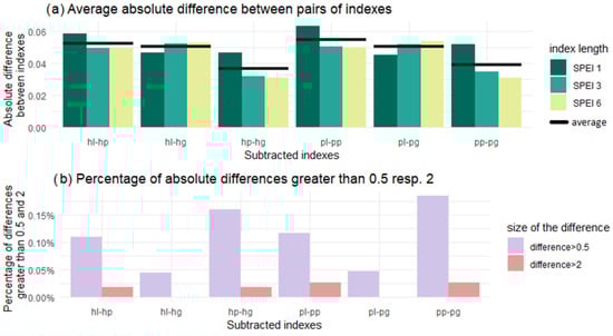 Before we analysed the individual statistical distributions, we wanted to know how the index would change if the studied parameter-statistical distribution was changed. We analysed absolute differences between the pairs of indices that differ only in used statistical distribution of water balance. Since we studied three statistical distributions (Log-logistic, GEV, and Pearson III), we had three different pairs of indices. So, for every pair of indices, we had approximately 14,200 (≈365 days × 39 years) differences for each of the two PET methods (P.M. and Harg.) at every station and for all three studied index lengths (1, 3, and 6 months). In this way, we obtained approximately 1,100,000 absolute differences for every pair of indices from which we subsequently calculated the average absolute difference and percentage of absolute differences greater than 0.5 and 2.