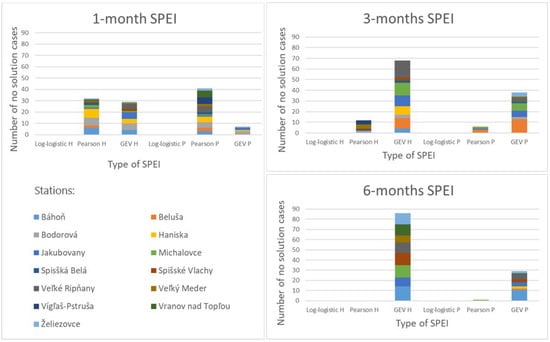The number of no-solution cases can depend on different factors including used distribution, method of PET calculation, length of the index, reference period of the index, and station (Figure 3).