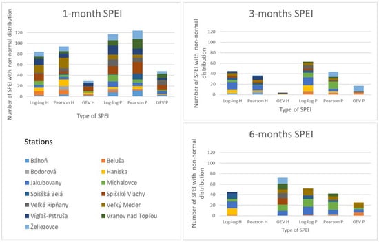From the view of our experiments of the S-W normality test, the GEV distribution had the lowest number of cases with SPEI not normally distributed and, therefore, the best result (Table 5). The same results were found for both used PET methods, and all three used lengths of the index, 1, 3, and 6 months (Figure 4). With the GEV distribution, 0.08% to 0.61% of the indices did not follow a normal distribution when using the Hargreaves method for PET calculation, and 0.36% to 1.01% did not follow a normal distribution when using the P.M. method for PET calculation. When we focus on the 1-month index, the second place took Log-logistic distribution (1.77% with PET = Harg and 2.47% with PET = P.-M.), and the third place took Pearson III distribution (1.99% with PET = Harg and 2.64% with PET = P.-M.). In the case of the 3-month and the 6-month index, the second-best distribution was Pearson III distribution (0.74–0.78% with PET = Harg and 0.83–0.89% with PET = P.-M.) and the most inappropriate distribution from the three studied distributions was Log-logistic (0.95% with PET = Harg and 1.10–1.33% with PET = P.-M.).