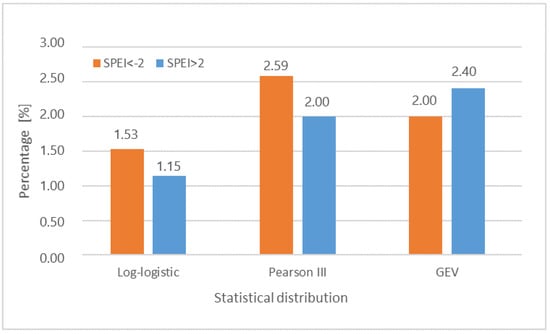 Figure 5. Percentages of SPEI greater than 2 (blue) or lower than −2 (orange) for three studied statistical distributions.