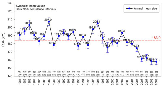 - Chan, J.C.L.; Yip, C.K.M. Interannual variations of tropical cyclone size over the western North Pacific. Geophys. Res. Lett. 2003, 30, 2267. [Google Scholar] [CrossRef]