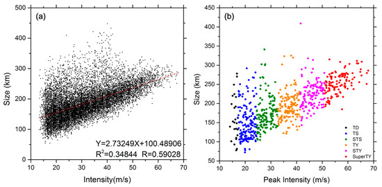 - Wu, L.; Tian, W.; Liu, Q.; Cao, J.; Knaff, J.A. Implications of the observed relationship between tropical cyclone size and intensity over the western North Pacific. J. Clim. 2015, 28, 9501–9506. [Google Scholar] [CrossRef]