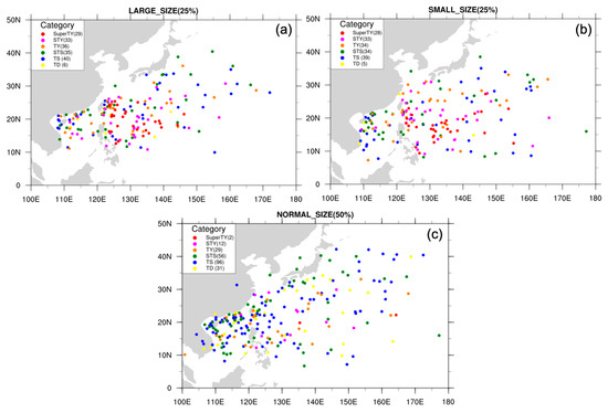 - Brand, S. Very large and very small typhoons of the western North Pacific Ocean. J. Meteorol. Soc. Jpn. 1972, 50, 332–341. [Google Scholar] [CrossRef]