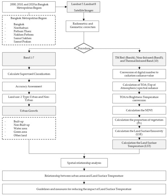 Landsat 5 and 8 satellite images were utilized to analyze changes in urban areas and urban temperatures within the Bangkok Metropolitan Region (BMR). Detailed images from Landsat satellites are presented in Table 2. The selection of satellite images involved choosing three cloud-free images (<10%) during the winter season to minimize analytical aberrations. These images were sourced from the Geo-Informatics and Space Technology Development Agency (public organization) and the website of the US Geological Survey (USGS) [].